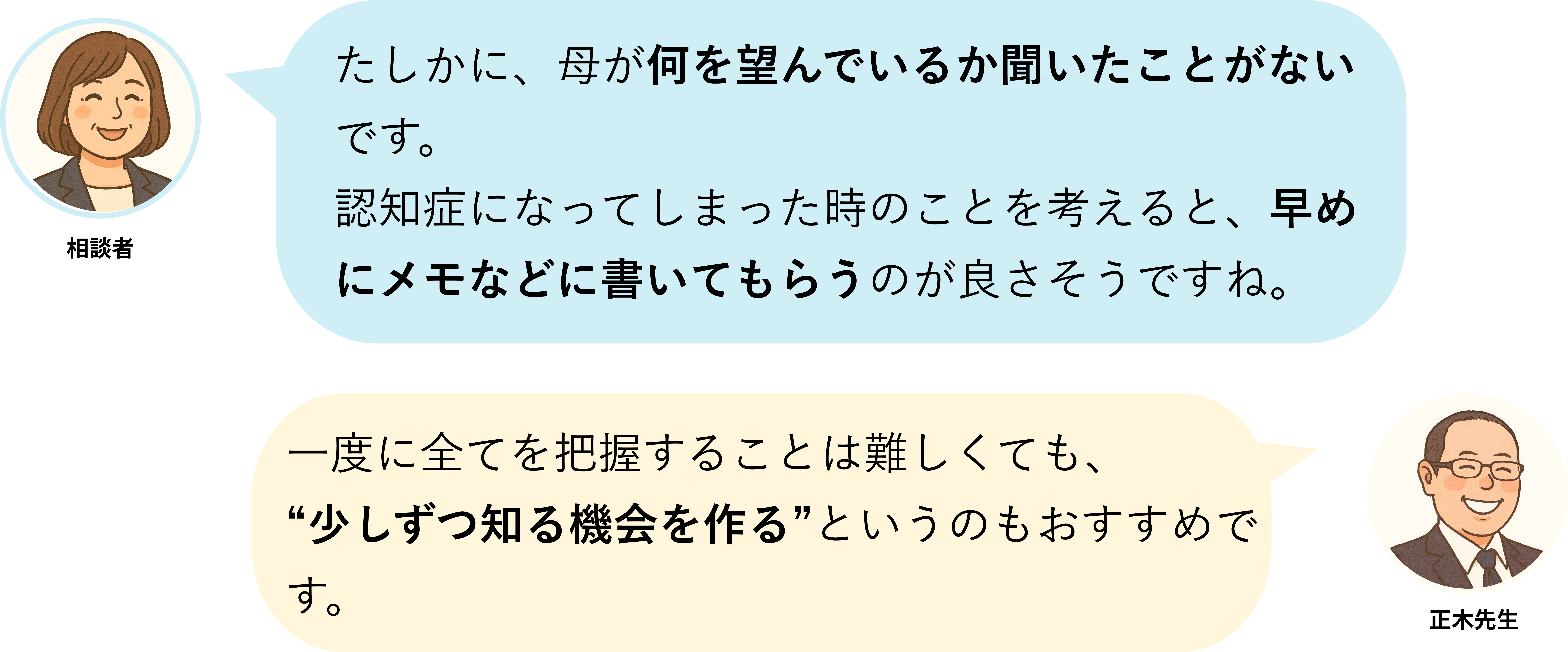 ご家族とお話する時は、自身のことを絡めて話をすることで自然と聞き出せることもあります。