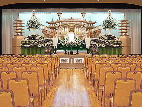 1階、2階それぞれに式場がございます。式場はすべて椅子席で床暖房と最新の音響・照明を完備しており、1階は250名様まで収容可能。150名様まで収容できる2階は、家族葬など少人数の葬儀にもご利用いただけます。各式場に遺族控室がございます。落ち着いた雰囲気の和室は寝具を10組まで敷くことが可能なゆったりとした広さです。また浴室やトイレ、簡易キッチン、液晶テレビなども完備。通夜でお泊まりの際にもご利用いただけます。