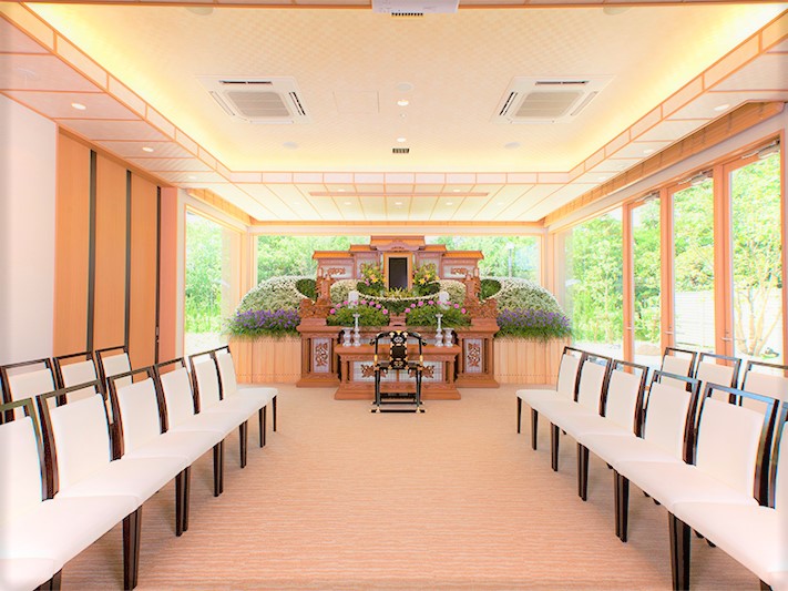 親族24名までの小規模葬儀・家族葬専用の会館です。1日につき1組の貸切スタイルでのご葬儀となります。式場はガラス張りで、ゆたかな光が入り、正面からは、そこに広がる美しい庭園を臨めます。またお出しするお料理にも心配りを。専門の職人が目の前で調理し、出来立てのものをお召し上がりいただけます。