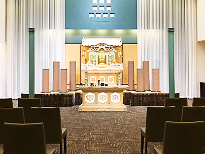 せまい空間をより広くし、おおらかな気持ちにさせる演出として、天井を入り口から徐々に高くしていき、7mの高さを天として天国へ行くイメージが特徴となっています。