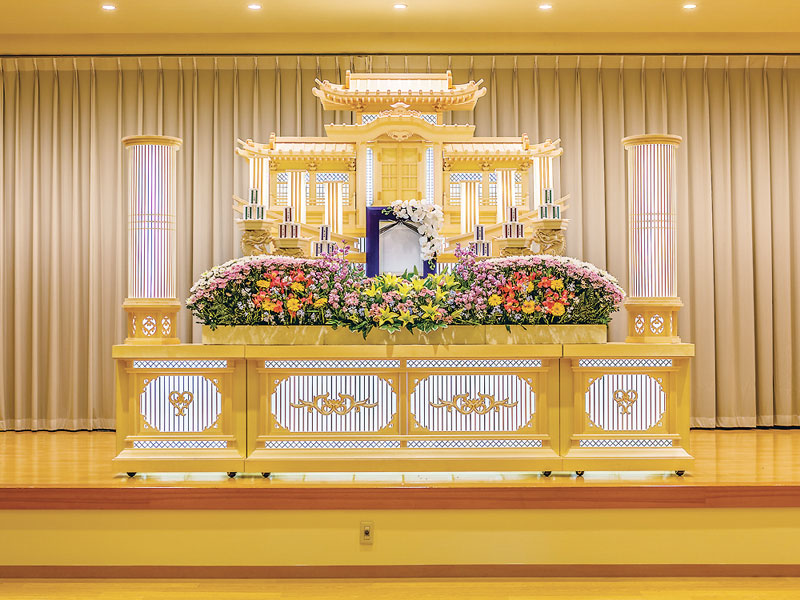 大式場・一般式場・小式場を備え、低予算で行う小規模葬、また家族葬や一般のご葬儀から社葬・団体葬などの大規模葬まで、スケールや内容を問わず幅広く対応。また祭壇は生花祭壇、白木祭壇に加え、生花が映える洋風祭壇も準備しております。親族控室や会食室も充実。