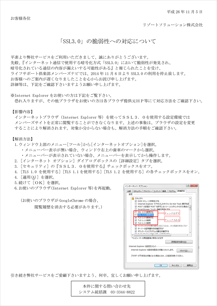 「ライフサポート倶楽部 メンバーズナビ」が正常に見られない場合につきましては、添付の書面をご確認いただき、ご対応願います。
