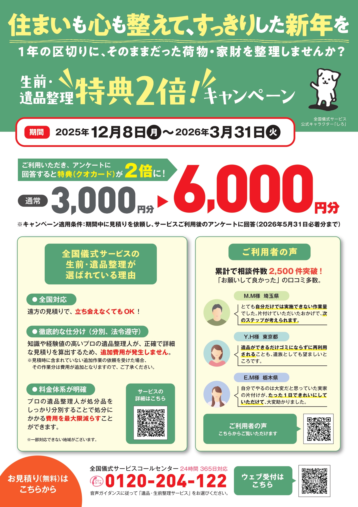 期間限定で特典が2倍となる生前整理・遺品整理応援キャンペーンを実施いたします。